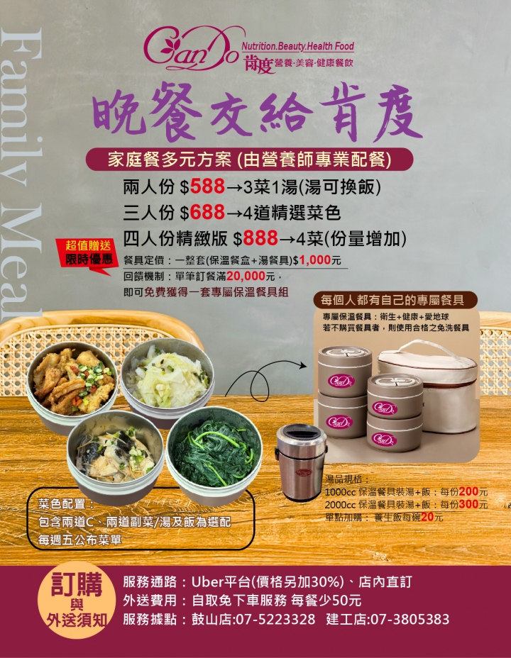 歡迎預定我們月子餐,十分健康美味,為您外送到府,且價格實惠,試吃預定電話:(07)522-3328。